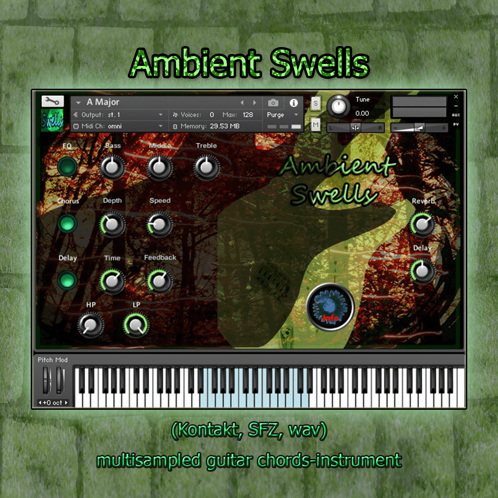 This instrument is good for adding ambient backgrounds for any kind of composition be it for video, game or music. Can be used for making backing tracks for ambient guitar players too. Swells are more emotive and organic than pads made by synthesizers. Due to making this instrument clean and by sampling individual chords instead of making production ready loops The Ambient Swells can be used over and over in audio production unlike other looped libraries with same theme. User has more freedom to shape his own sounds by using different kind of effects. There is more information in the included manual.