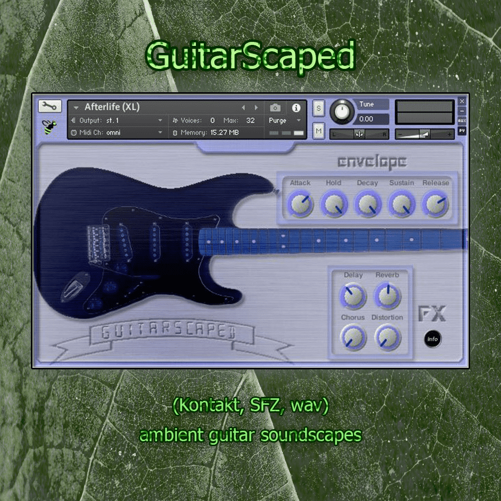 Source for GuitarScaped library was obviously a guitar. It was very processed and transformed into ambient machine hence the scape in the name. End results are otherworldly atmospheres, deep drones, ethereal ambiances, textures, organic soundscapes and evolving pads. If you like non-static evolving sounds this is the product for you.